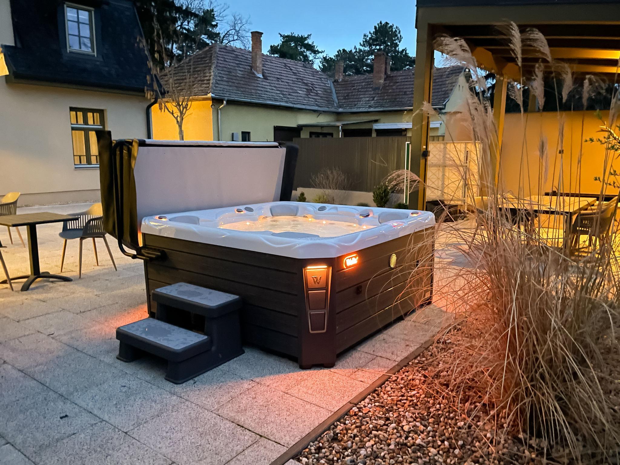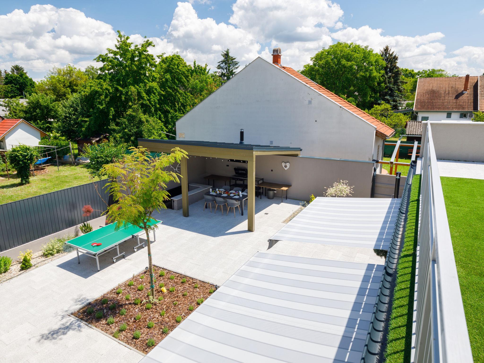 Balatonszárszó 5 km from Balatonföldvár: Large, modern, beautiful apartment house, built in 2023. 5 apartments in the residence. Excellent location: right in the centre but still quiet, 290 m from the lake, 350 m from the beach. Private: property (fenced). Outdoor shower, hot tub, table tennis, pergola, garden furniture, barbecue, children's playground (slide, sandbox). In the house: WiFi, table tennis, billiard table, table football, sun terrace, central heating system, air conditioning, washing machine, tumble dryer. Breakfast on request (extra). Parking at the house. Grocery 90 m, supermarket 7 km, restaurant, café 140 m, bicycle rental 150 m, bus stop 850 m, railway station 200 m, 200 m, thermal baths "Csiszta" 36 km. Surf school 4 km, sailing school 1 km, tennis 500 m, riding stable 9 km, children's playground 600 m. Nearby attractions: Siófok Bella Zoo 24 km, Tihany 12 km, Siófok Theme Pak 24 km, Festetics Castle 57 km, Hévíz 61 m.