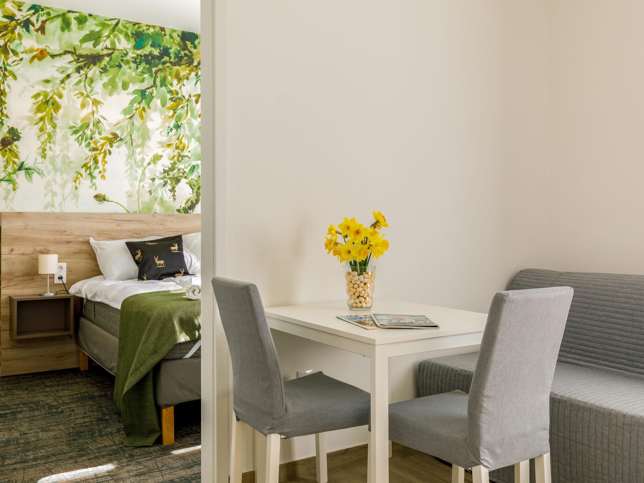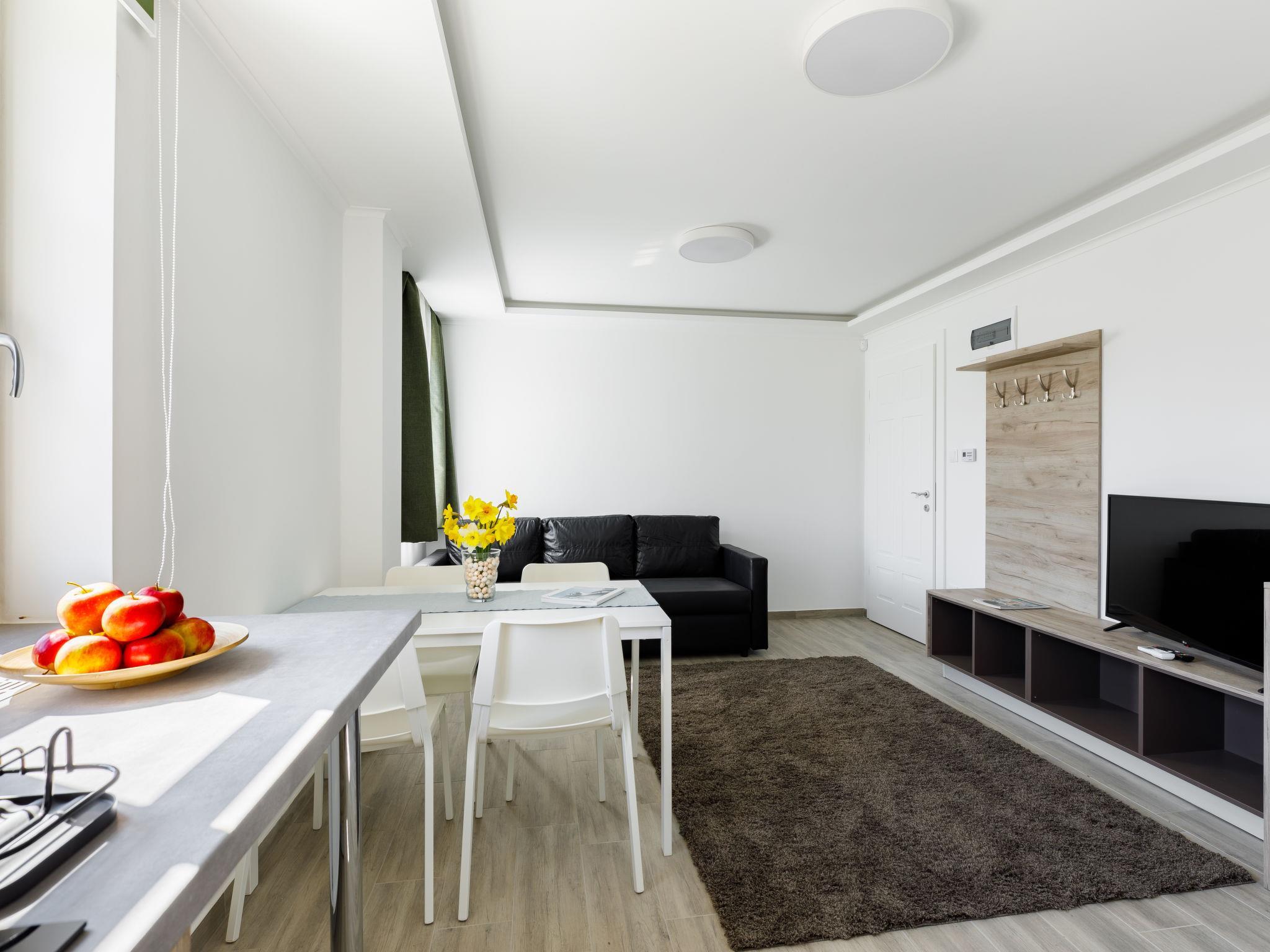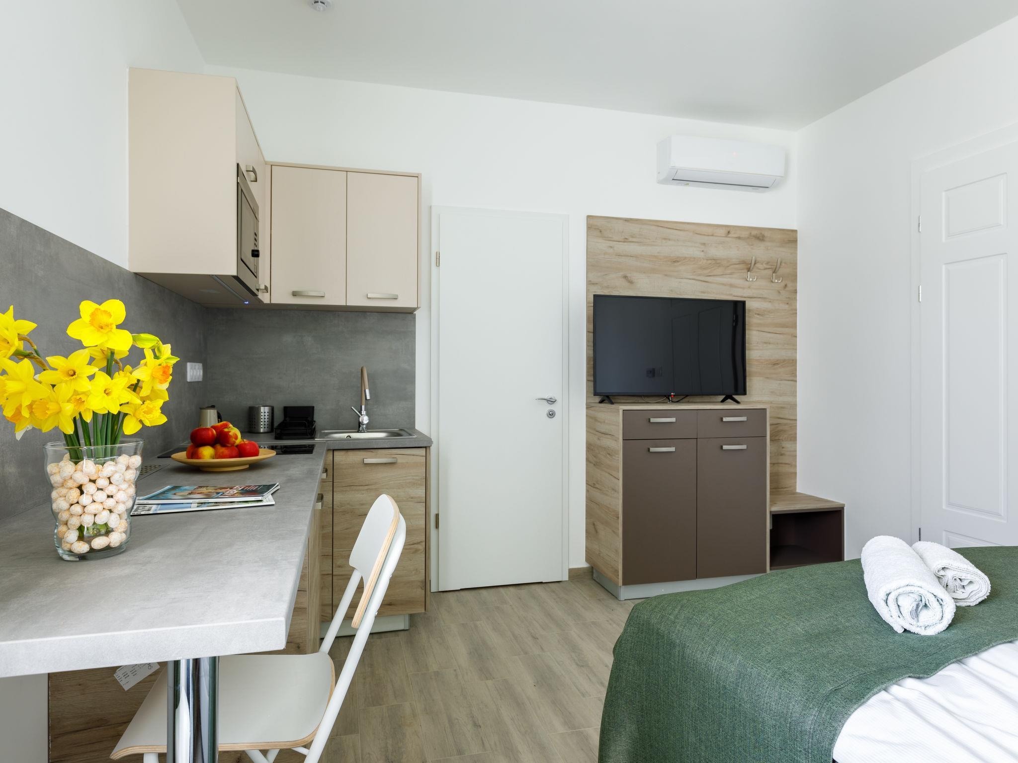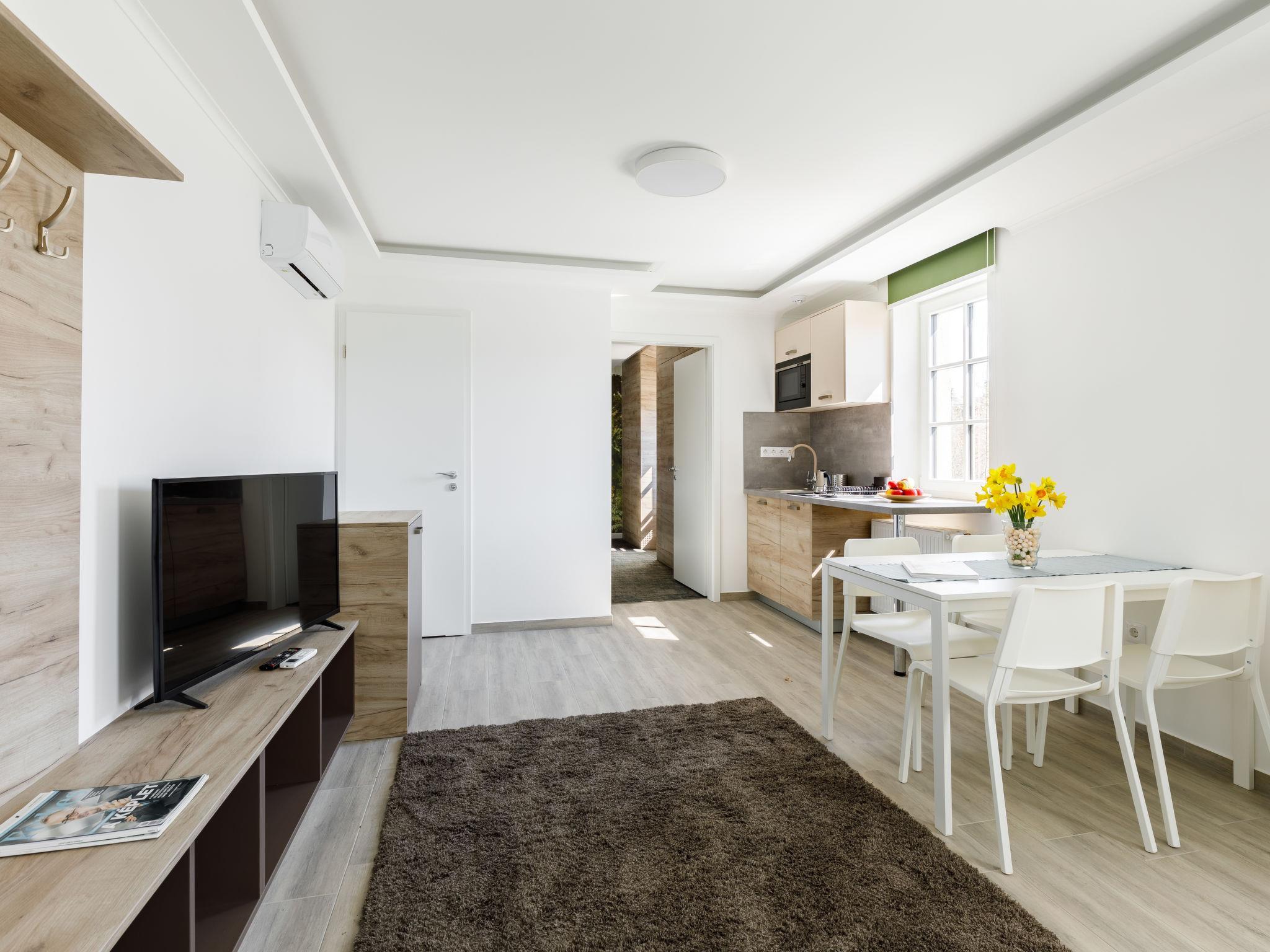 "Park Residence 12", 10-room villa on 2 levels. Beautiful and modern furnishings: open living/dining room, window onto the courtyard with dining table, kitchen corner, shower/WC and cable TV (flat screen). 1 double bedroom with 1 french bed (160 cm, length 200 cm). Studio, window onto the courtyard with 1 french bed (160 cm, length 200 cm), dining nook, kitchen corner, shower/WC and cable TV (flat screen). Open living/dining room with dining table, kitchen corner, shower/WC and cable TV (flat screen). Exit to the terrace. 1 double bedroom with 1 french bed (160 cm, length 200 cm). Billiard room with dining table, kitchen corner, separate WC and cable TV (flat screen). Exit to the terrace. Small kitchenette (2 hot plates, microwave). Upper floor: open living/dining room with dining table, kitchen corner, shower/WC and cable TV (flat screen). 1 double bedroom with 1 french bed (160 cm, length 200 cm). Open living/dining room with dining table, kitchen corner, shower/WC and cable TV (flat screen). 2 double bedrooms, each room with 1 french bed (160 cm, length 200 cm). (microwave, electric coffee machine). Air-conditioning, floor heating. Solar power. Facilities: children's high chair, baby cot (extra), hair dryer. All five apartments are equipped with electric coffee mashine, microwave and double hotplates.