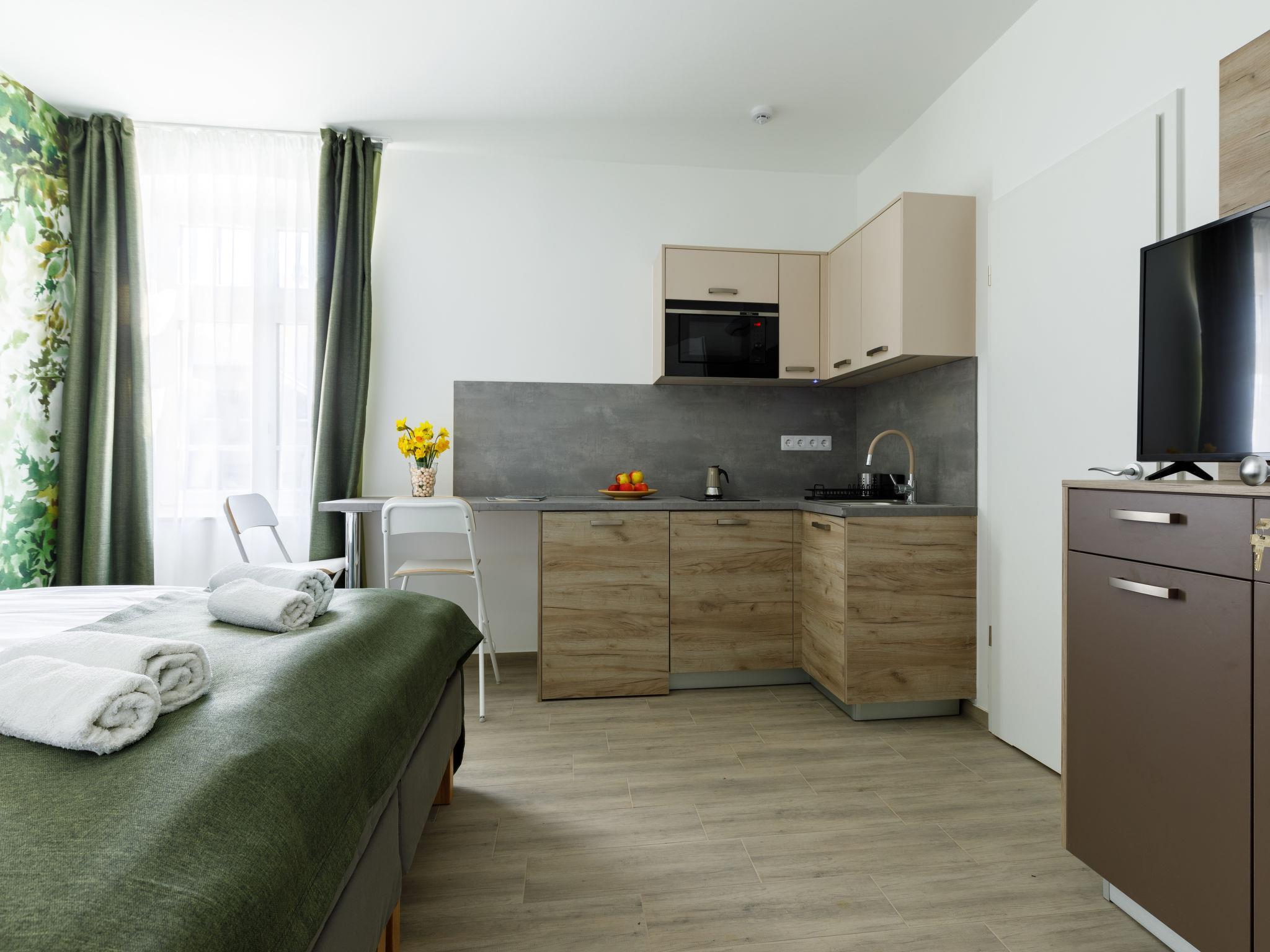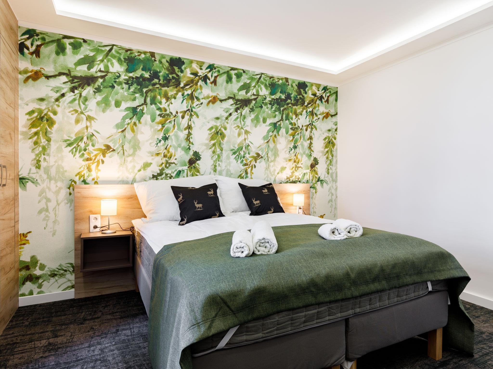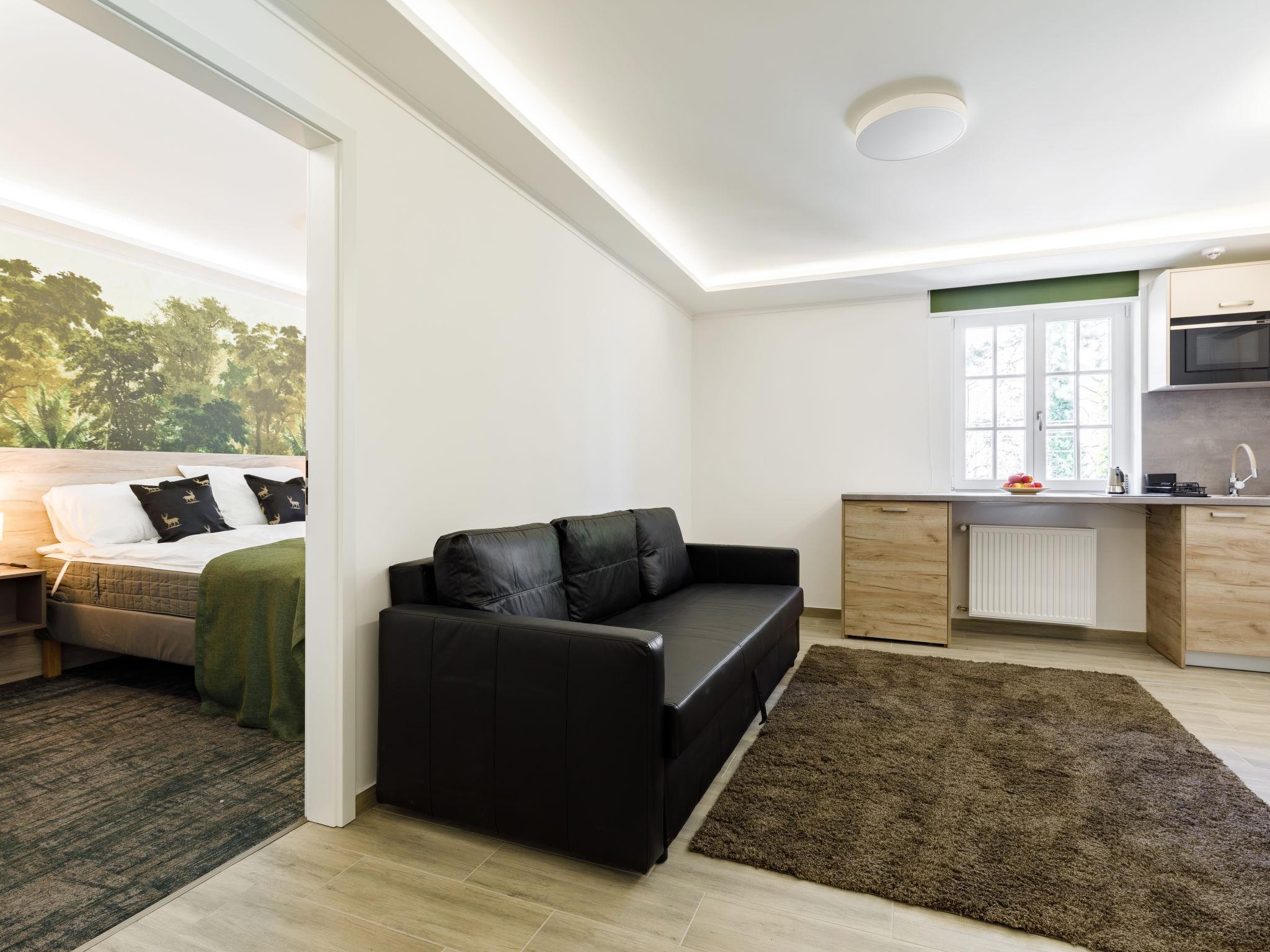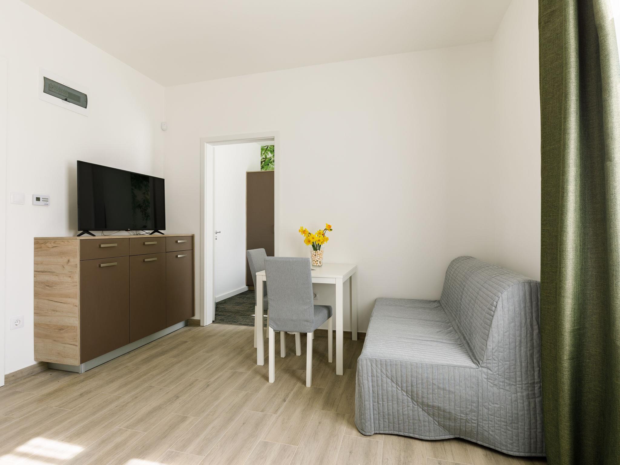 "Park Residence 12", 10-room villa on 2 levels. Beautiful and modern furnishings: open living/dining room, window onto the courtyard with dining table, kitchen corner, shower/WC and cable TV (flat screen). 1 double bedroom with 1 french bed (160 cm, length 200 cm). Studio, window onto the courtyard with 1 french bed (160 cm, length 200 cm), dining nook, kitchen corner, shower/WC and cable TV (flat screen). Open living/dining room with dining table, kitchen corner, shower/WC and cable TV (flat screen). Exit to the terrace. 1 double bedroom with 1 french bed (160 cm, length 200 cm). Billiard room with dining table, kitchen corner, separate WC and cable TV (flat screen). Exit to the terrace. Small kitchenette (2 hot plates, microwave). Upper floor: open living/dining room with dining table, kitchen corner, shower/WC and cable TV (flat screen). 1 double bedroom with 1 french bed (160 cm, length 200 cm). Open living/dining room with dining table, kitchen corner, shower/WC and cable TV (flat screen). 2 double bedrooms, each room with 1 french bed (160 cm, length 200 cm). (microwave, electric coffee machine). Air-conditioning, floor heating. Solar power. Facilities: children's high chair, baby cot (extra), hair dryer. All five apartments are equipped with electric coffee mashine, microwave and double hotplates.