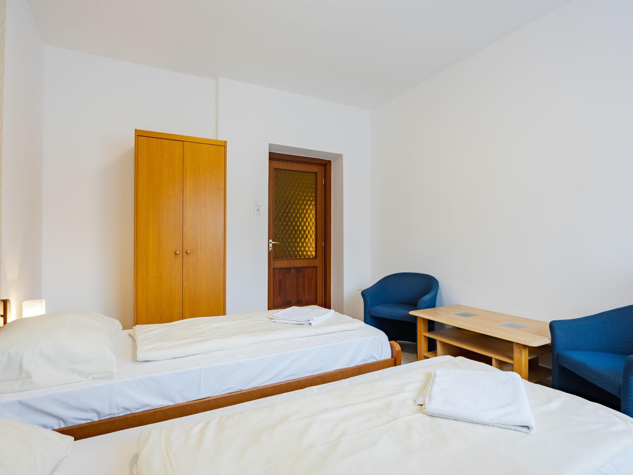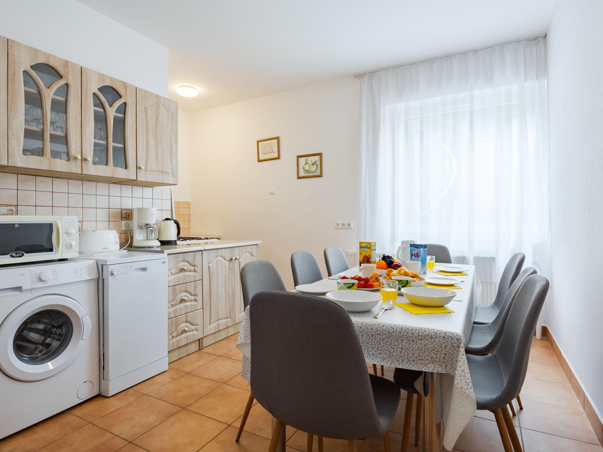 "Moni 1", 7-room apartment 200 m2. Spacious, comfortable furnishings: entrance hall with satellite TV. Exit to the terrace. 3 rooms, each room with 2 beds (90 cm, length 200 cm). Open kitchen (4 hot plates, oven, dishwasher, toaster, kettle, microwave, freezer, electric coffee machine). 2 showers/WC. Heating, gas heating (extra), air-conditioning. Upper floor: entrance hall. Exit to the balcony. Living room with satellite TV and air conditioning. 3 rooms, each room with 3 beds and air conditioning. Open kitchen (3 hot plates, oven, dishwasher, toaster, kettle, microwave, freezer, electric coffee machine). Exit to the balcony. Shower/WC, sep. WC. Terrace furniture, balcony furniture, barbecue (portable), deck chairs (10). Facilities: children's high chair, baby cot (extra). Parking (fenced 4 cars). Maximum 1 pet/ dog allowed. Please note: there is a grocery shop in the building on the road side. MA19022039