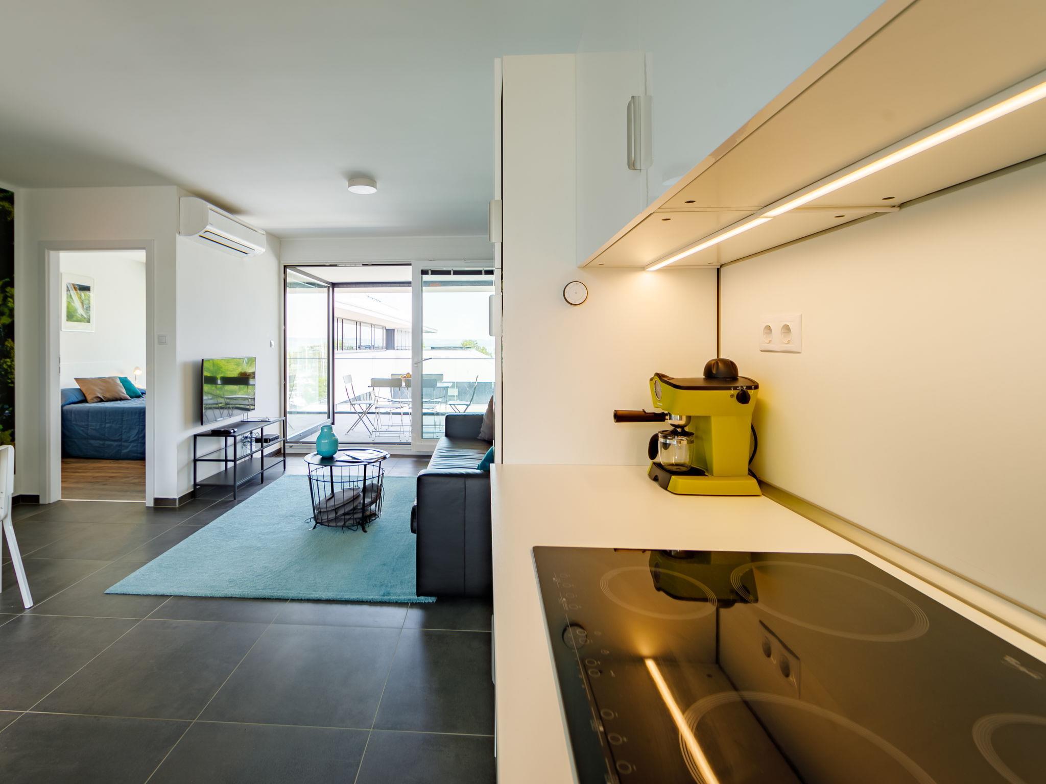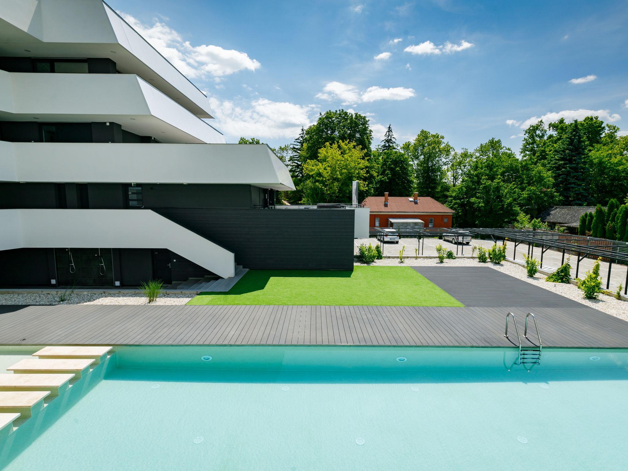 Balatonszemes 7 km from Balatonlelle: Modern, beautiful apartment block, built in 2020. In the resort, in a central position, 100 m from the lake, 350 m from the beach. For shared use: swimming pool angular heated (8 x 20 m, seasonal availability: 15.May. - 15.Sep.). In the house: internet café, WiFi, lift, sun terrace. Breakfast on request (extra). Grocery 200 m, restaurant 100 m, railway station 450 m, grass beach 300 m. Sports harbour 100 m. Nearby attractions: Tihany 14 km.
