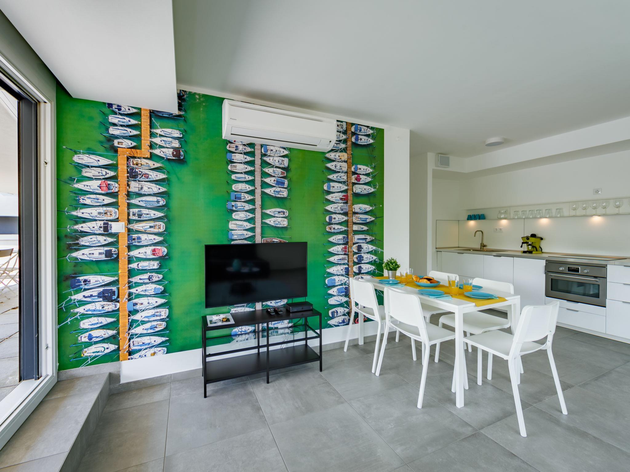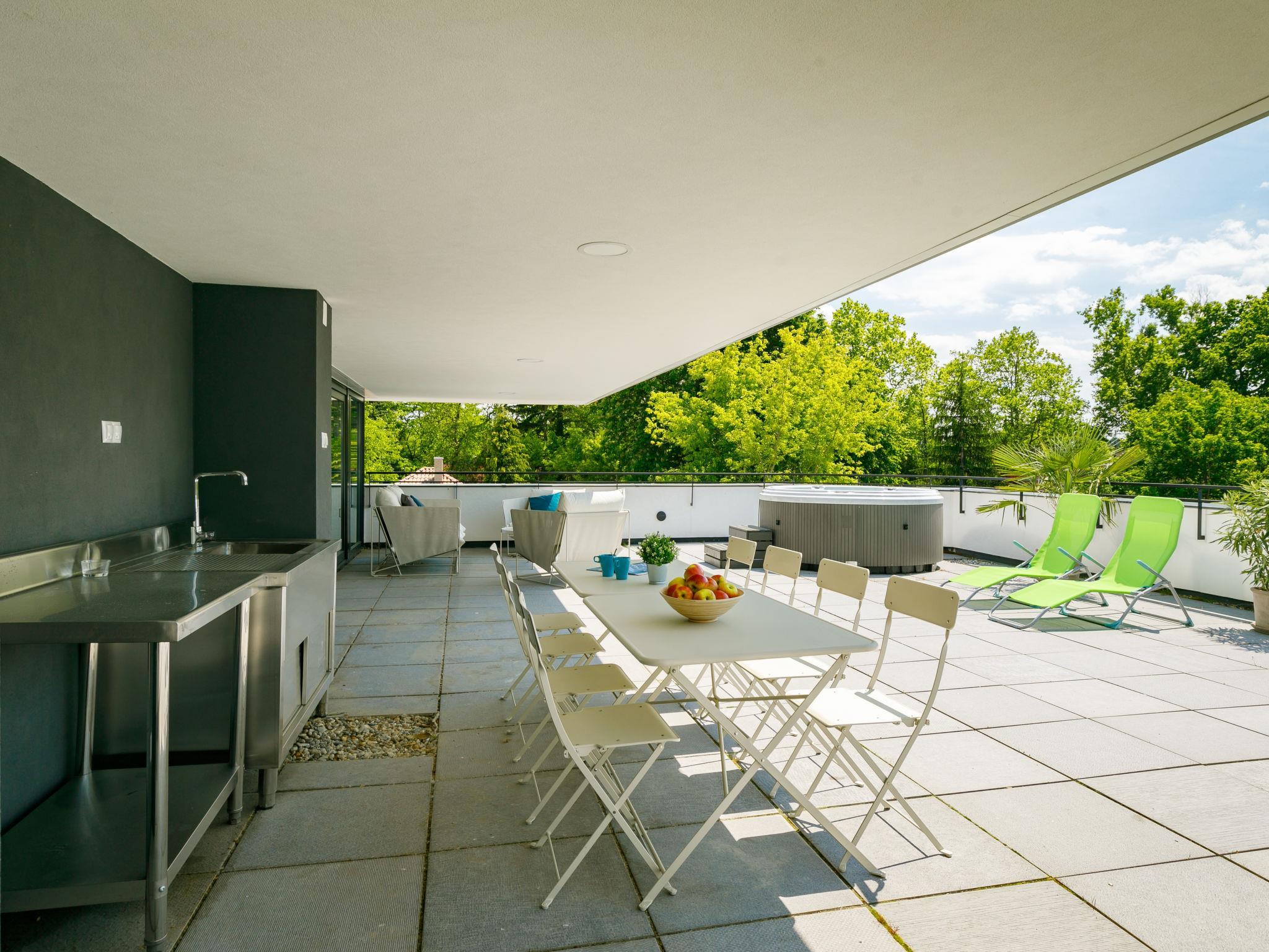"Kenese", 3-room apartment 60 m2 on 2nd floor. Modern and tasteful furnishings: large living/sleeping room with 1 pull-out bed (2 pers.), cable TV and air conditioning. Exit to the terrace. 2 rooms, each room with 1 french bed. Open kitchen (oven, dishwasher, toaster, kettle). Shower/WC, sep. WC. Heating, floor heating. Large terrace 60 m2. Terrace furniture. Facilities: children's high chair, baby cot (extra). Internet (WiFi). Parking (1 car). Maximum 1 pet/ dog allowed. Hot tub is private. EG21000354