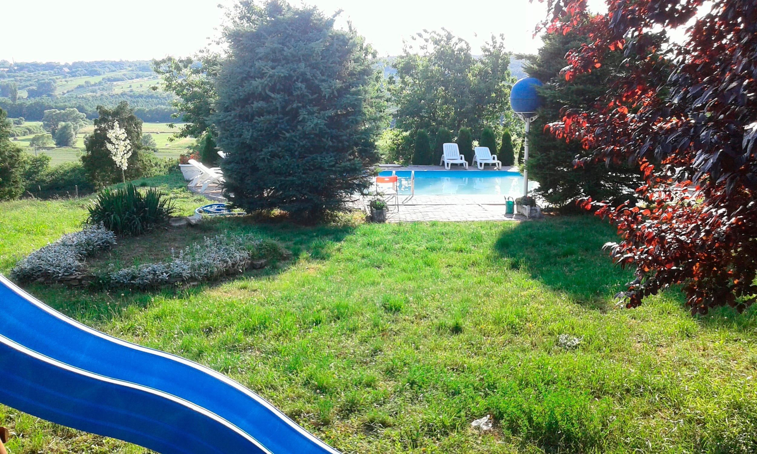 Zur gemeinsamen Nutzung stehen zur Verfügung: Sonnernliegen, Gartendusche, Grillmöglichkeiten, ein Pavillon und der Außenpool. (5,5 m x 12 m). Der Vermieter wohnt im Nachbarhaus.