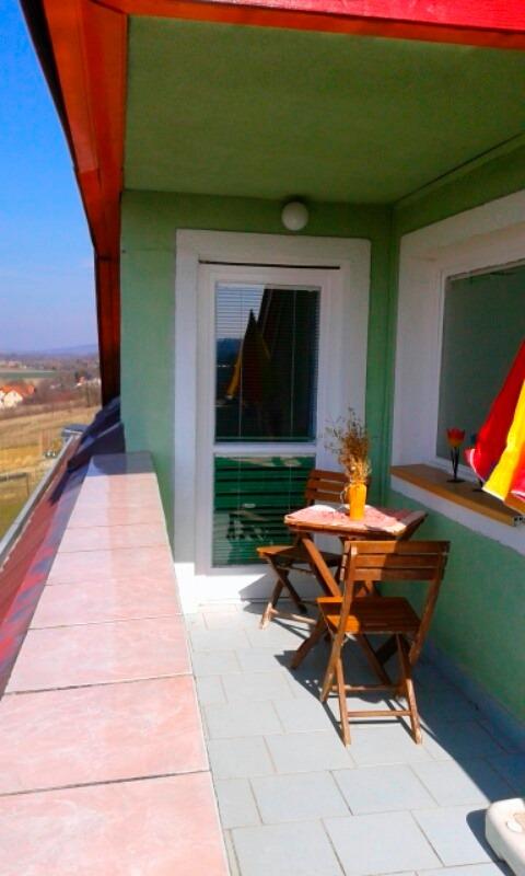 Die Ferienwohnung verfügt über einen überdachten Südbalkom mit herrlicher Aussicht auf Wiesen, Weinberge und den Wald. Die Wohnung ist komfortabel und praktisch eingerichtet.