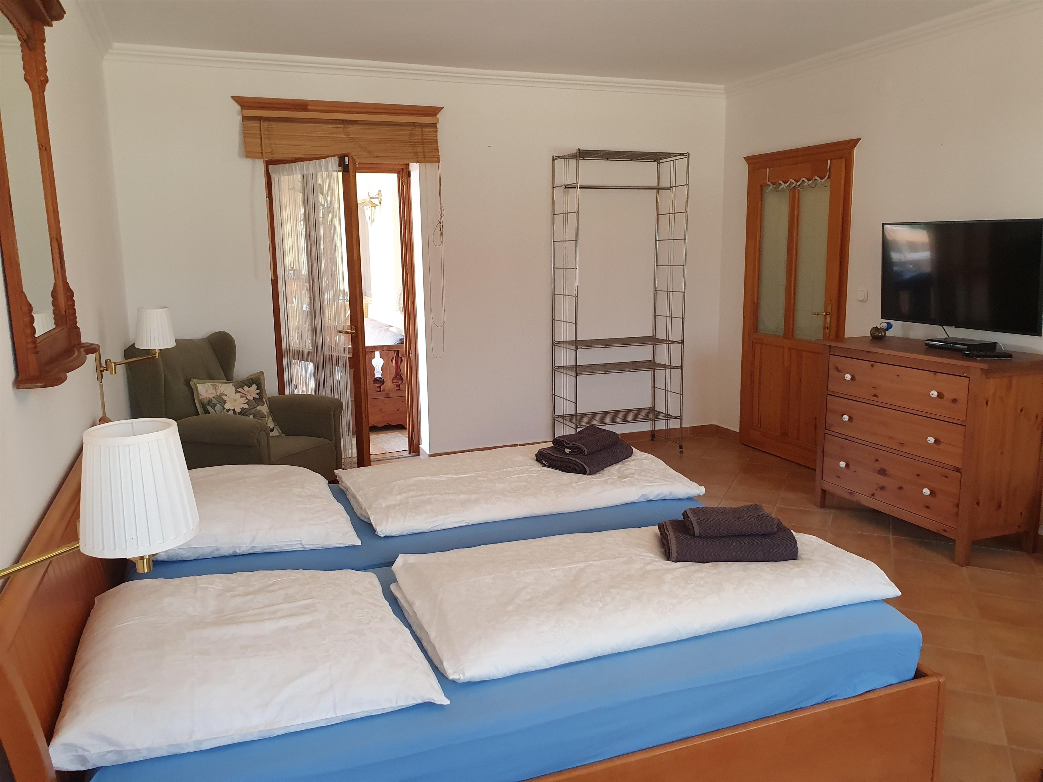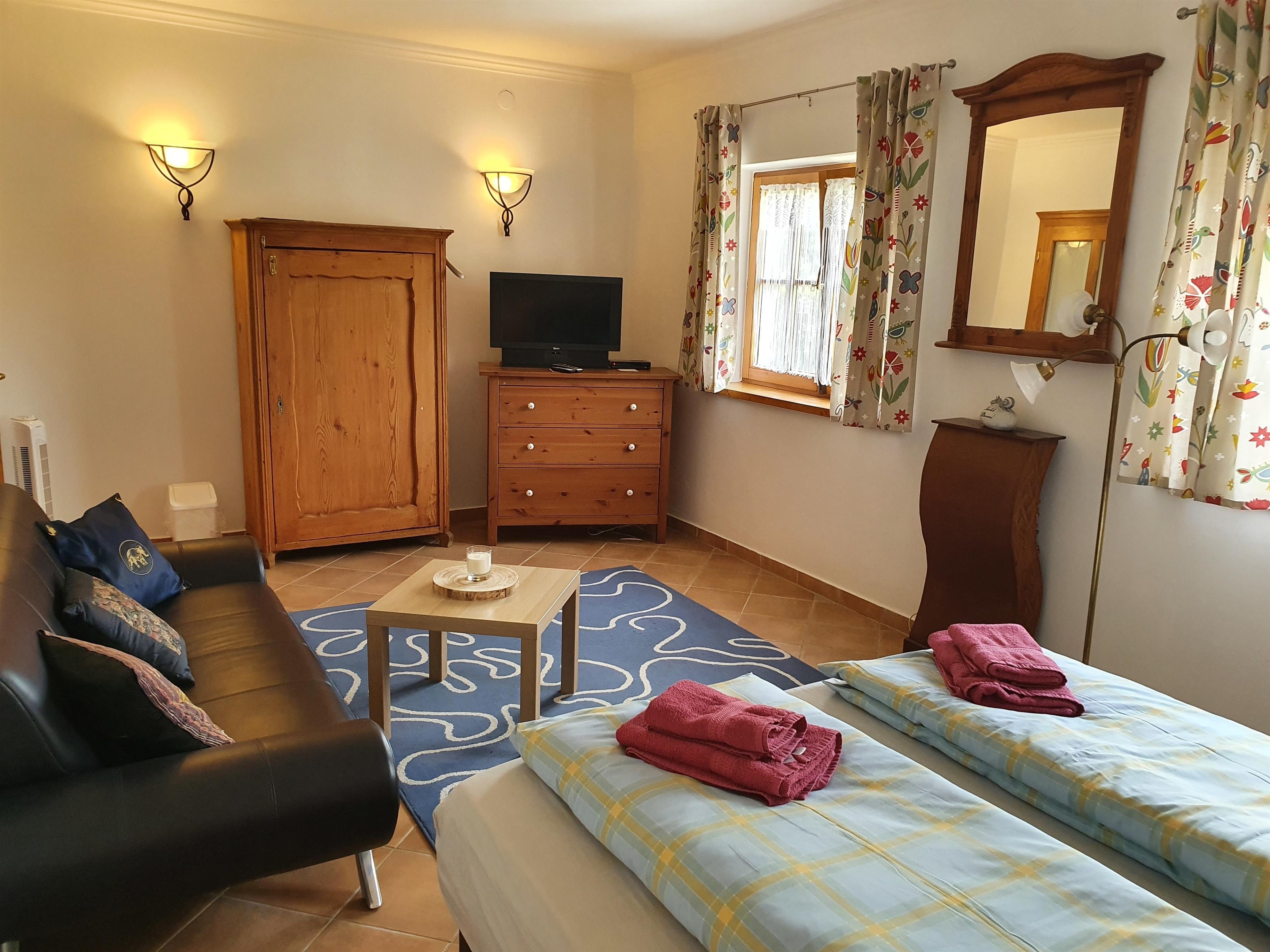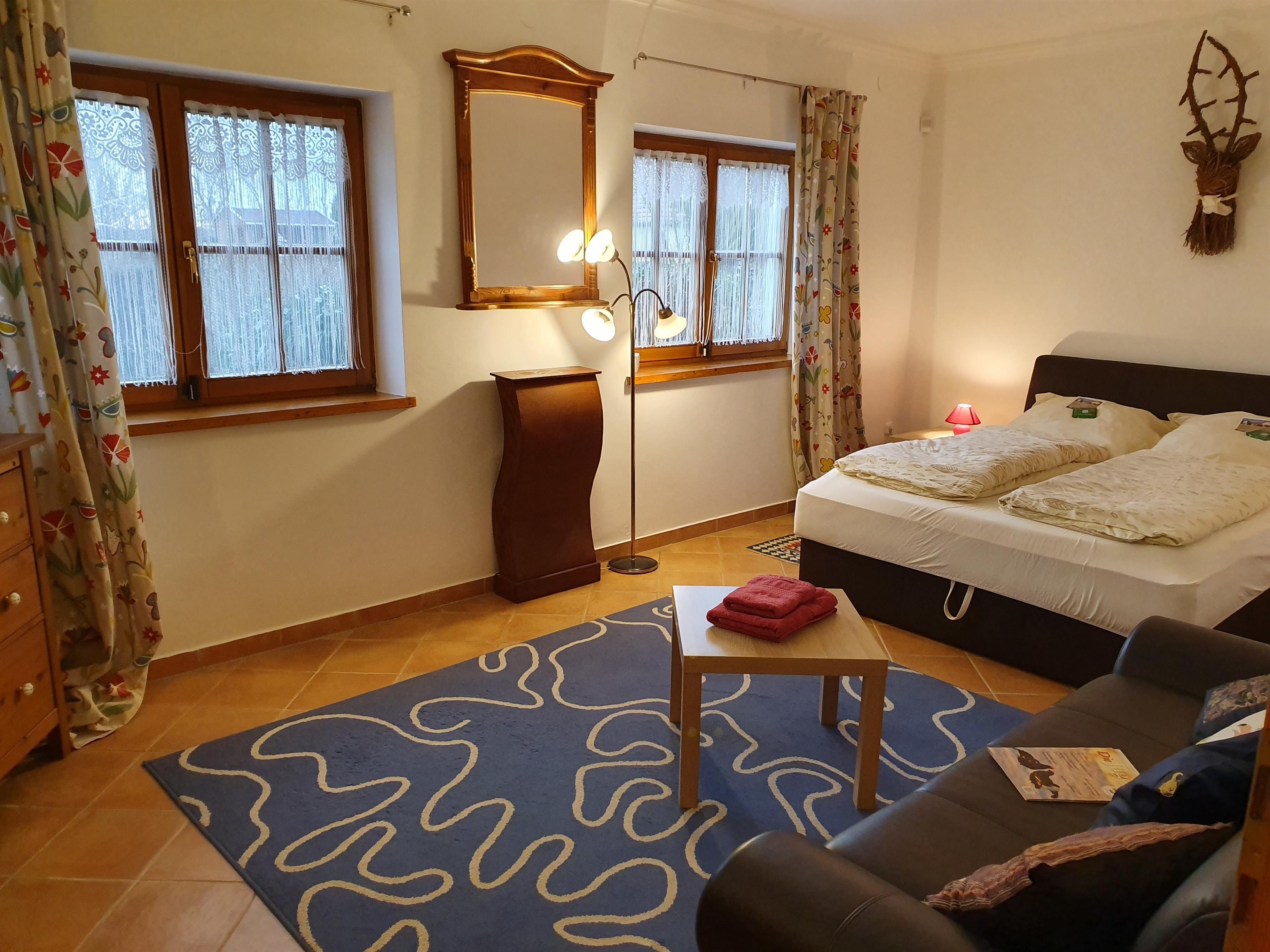 3 große, frisch renoviert und geschmackvoll eingerichtete Doppelzimmer geben die Möglichkeit sich zu entfalten. Ein zusätzliches Einzelzimmer ist auf 2 Personen erweiterbar oder als Familienzimmer nutzbar. Eine große Wohnküche mit Ofen rundet das Angebot ab. Das Grundstück, 5000 m² ist komplett eingezäunt. Der Innenhof ist sep. abschließbar. Ein Grill ist im großen Garten fest installiert. Ein Hundeparcours sowie ein Bogenparcours befinden sich im hauseigen parkähnlichen Garten.