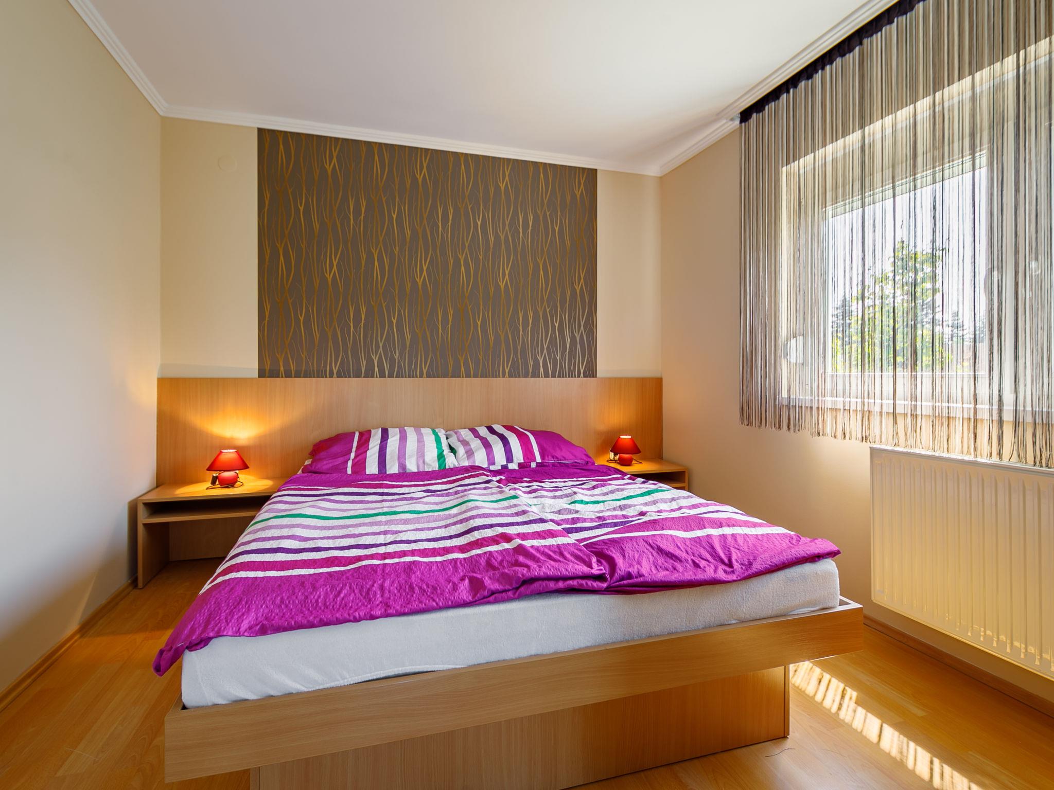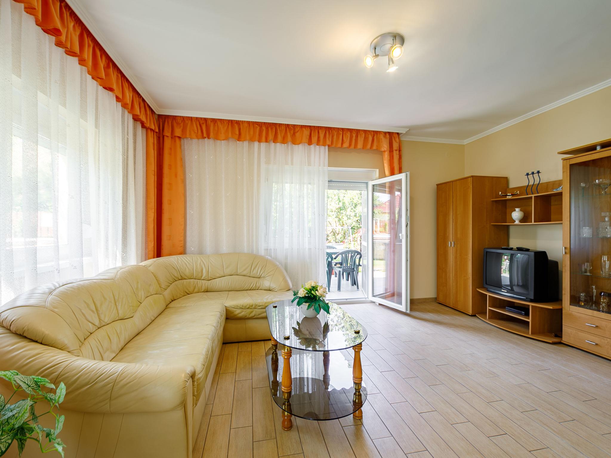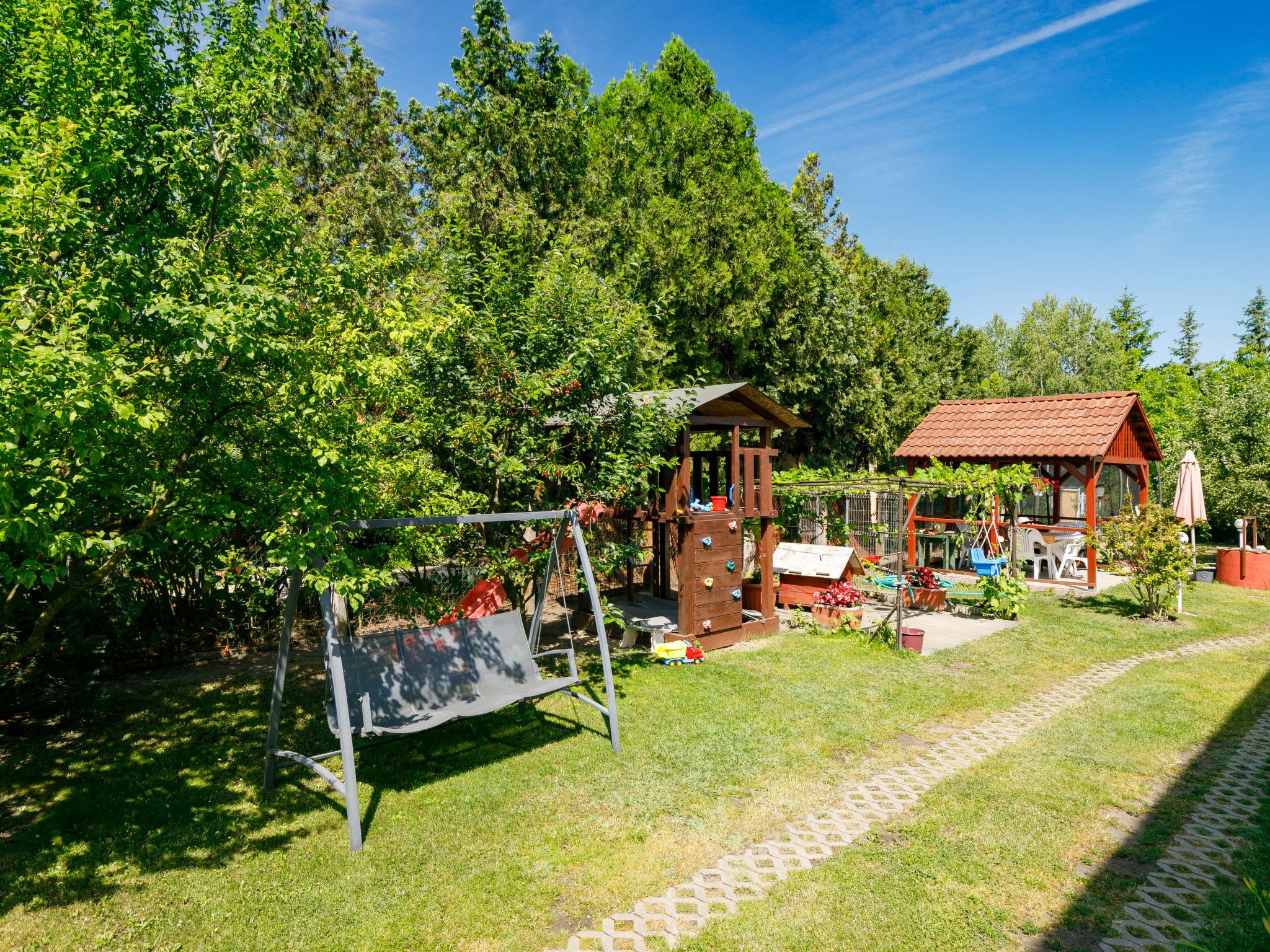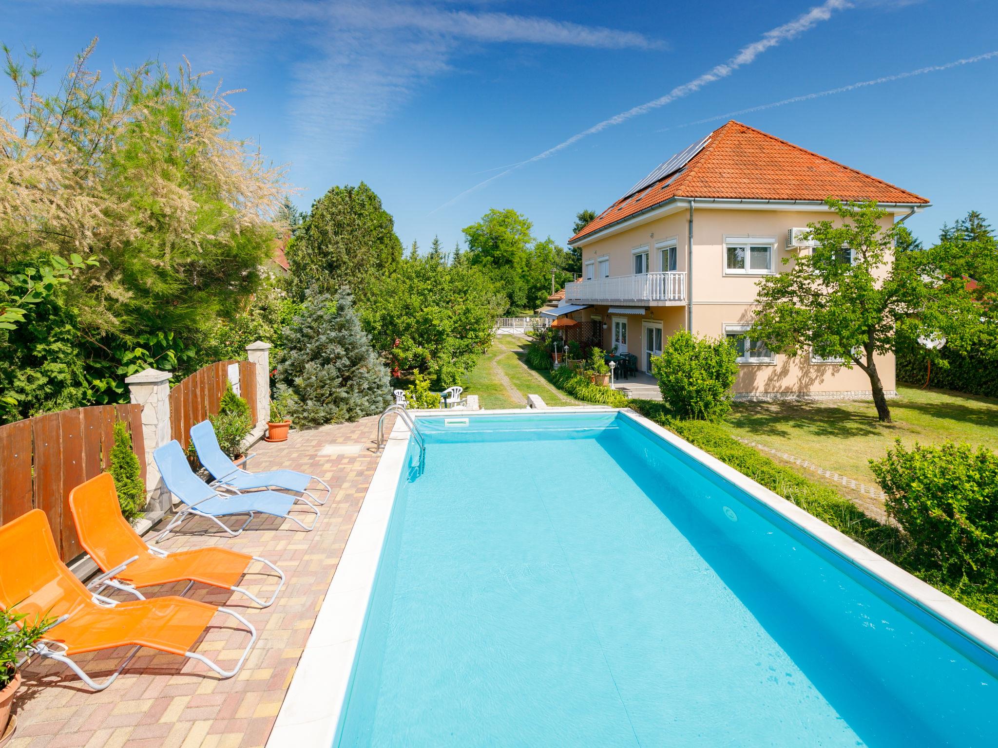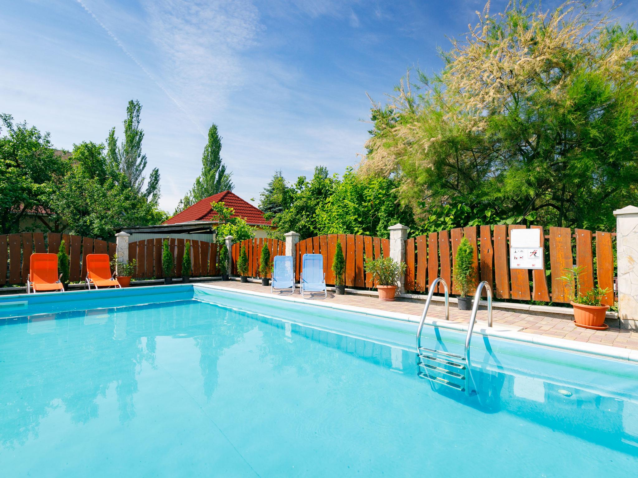 Zamárdi 10 km from Siófok: Cosy apartment block. In the resort, in a sunny position, 300 m from the lake, 700 m from the beach. For shared use: garden 600 m2 (fenced) with flowers and trees, lawn for sunbathing, swimming pool angular (8 x 4 m, depth 150 cm, seasonal availability: 15.May. - 15.Sep.). Outdoor shower, table tennis, garden furniture, barbecue, fireplace, children's playground (slide, sandbox). In the house: WiFi, air conditioning, washing machine (extra) (for shared use). Grocery 250 m, restaurant, bakery 200 m, café 300 m, grass beach 400 m. Please note: railway line closeby.