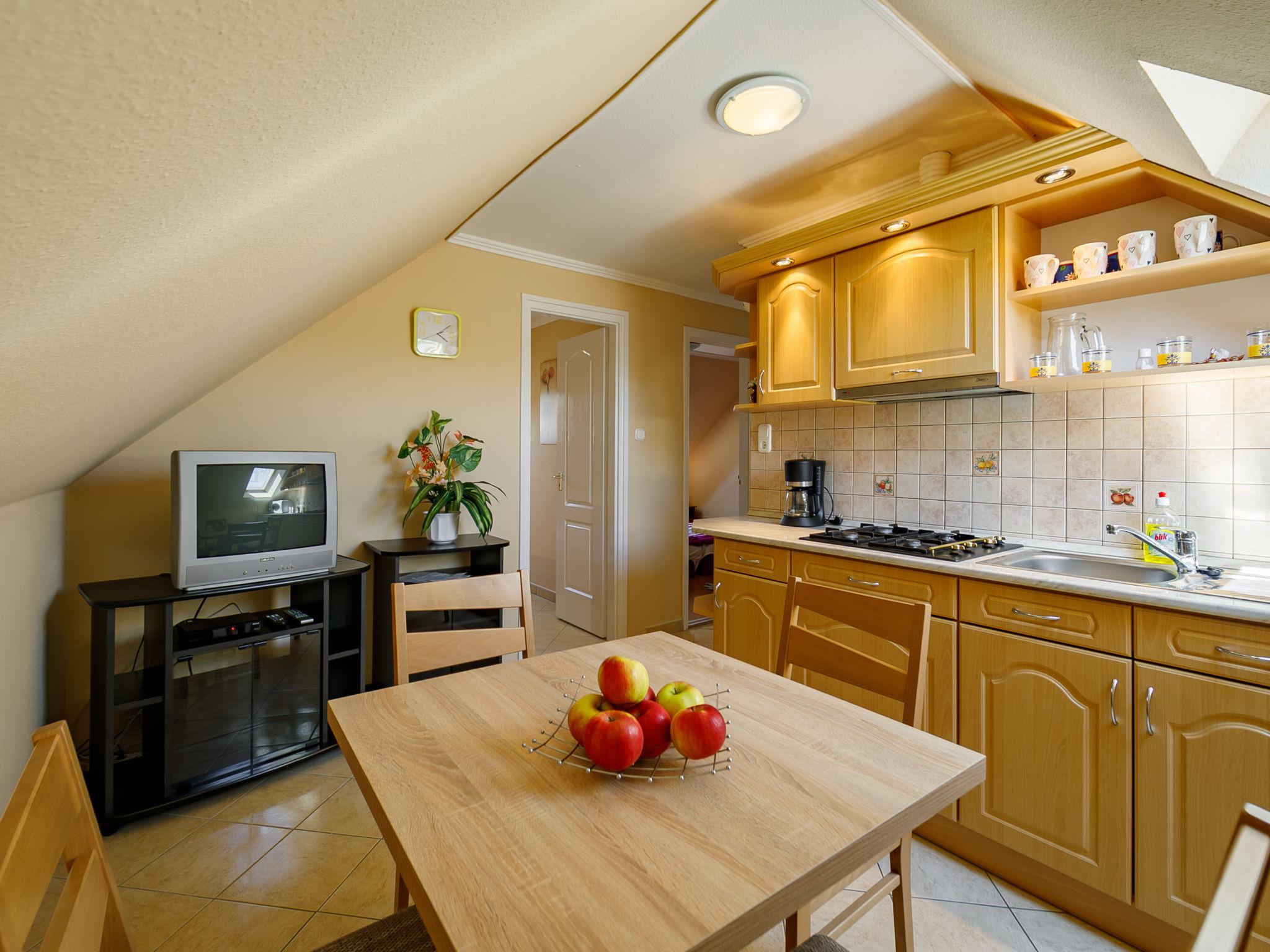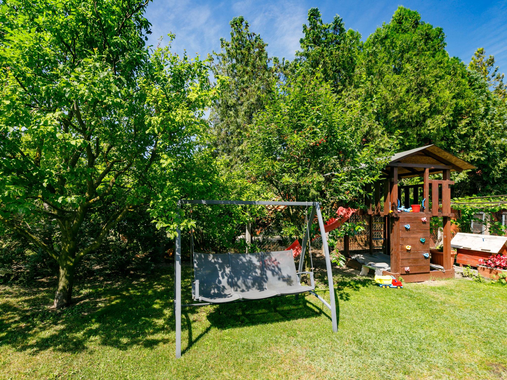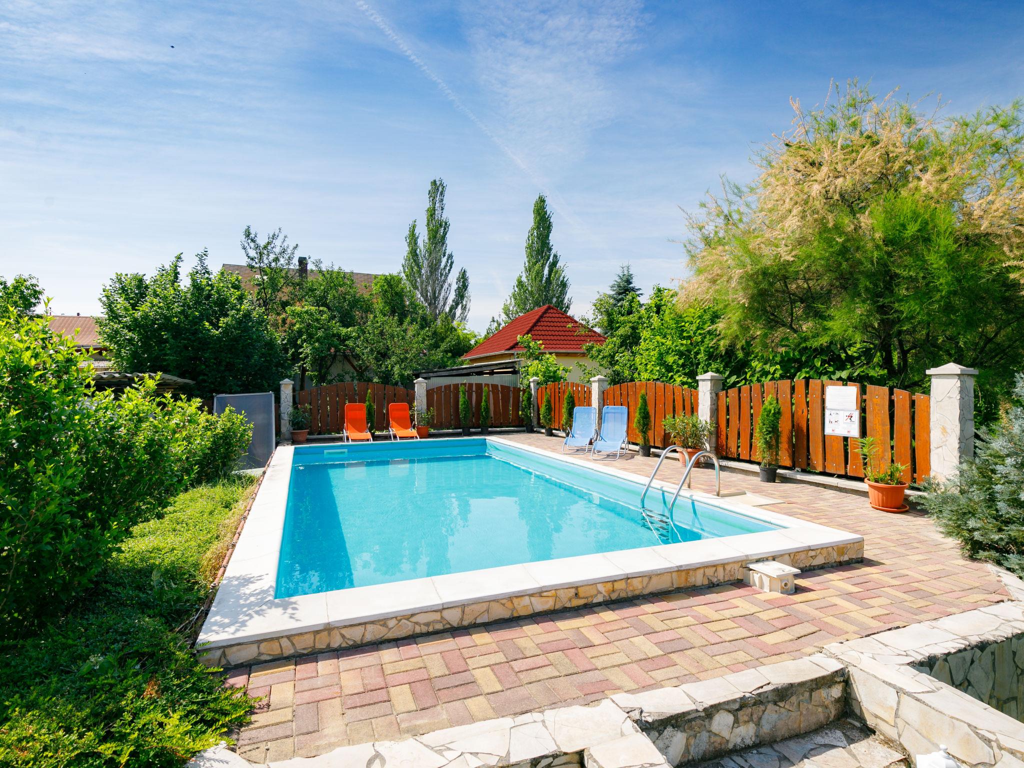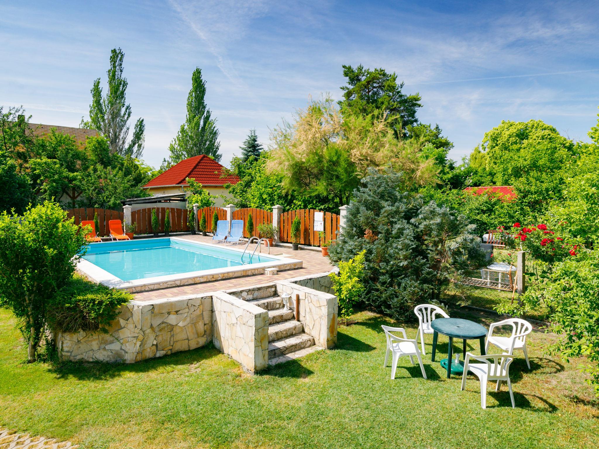 Zamárdi 10 km from Siófok: Cosy apartment block. In the resort, in a sunny position, 300 m from the lake, 700 m from the beach. For shared use: garden 600 m2 (fenced) with flowers and trees, lawn for sunbathing, swimming pool angular (8 x 4 m, depth 150 cm, seasonal availability: 15.May. - 15.Sep.). Outdoor shower, table tennis, garden furniture, barbecue, fireplace, children's playground (slide, sandbox). In the house: WiFi, air conditioning, washing machine (extra) (for shared use). Grocery 250 m, restaurant, bakery 200 m, café 300 m, grass beach 400 m. Please note: railway line closeby.