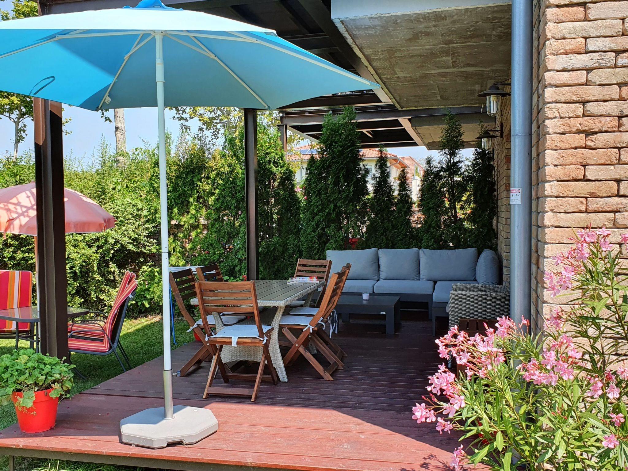The living room opens onto the terrace with seating and a parasol.