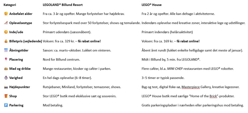 • LEGOLAND® er ideelt, hvis I vil have en hel dag med forlystelser, shows og udendørs aktiviteter. Perfekt til børn fra ca. 3 år og opefter.
